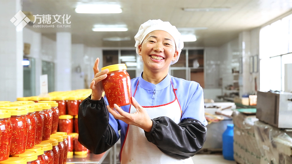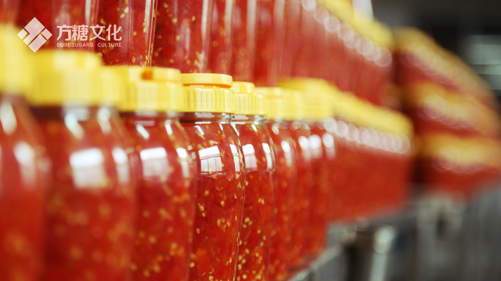 来到一代食品生产车间,成排的辣椒酱看着就让人胃口大开。旁边的质检经理和工人专心致志地逐瓶检查着产品的密封情况。